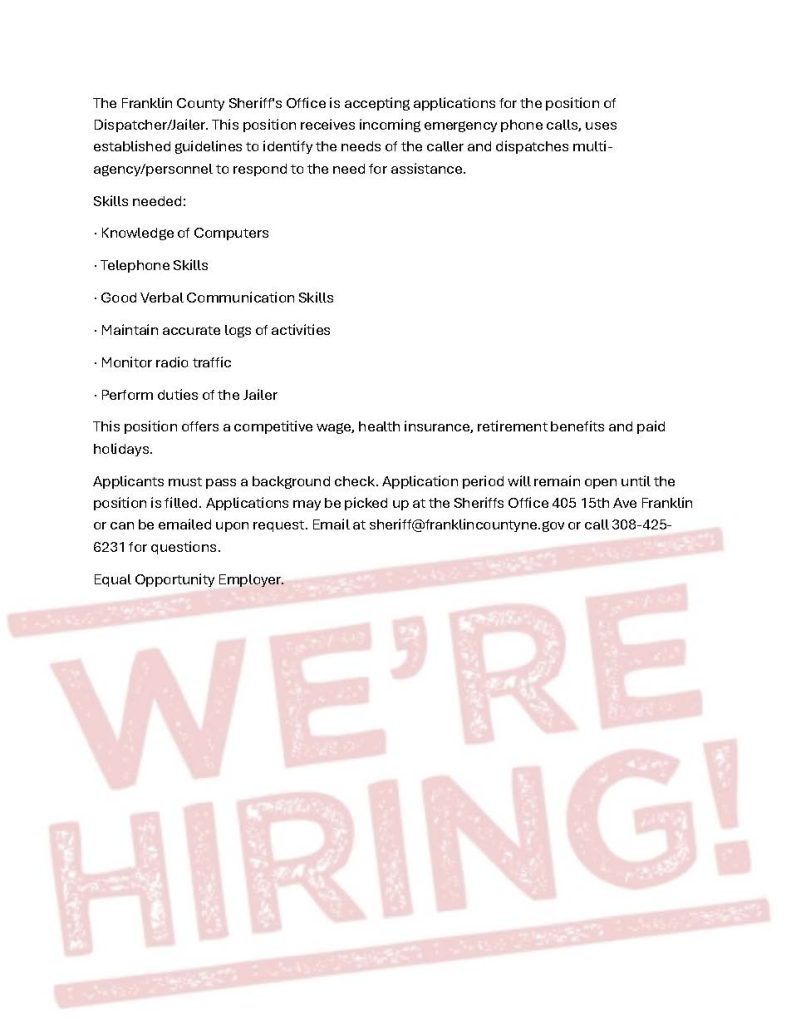 Franklin County Sheriff’s Office – Dispatch/Jailer